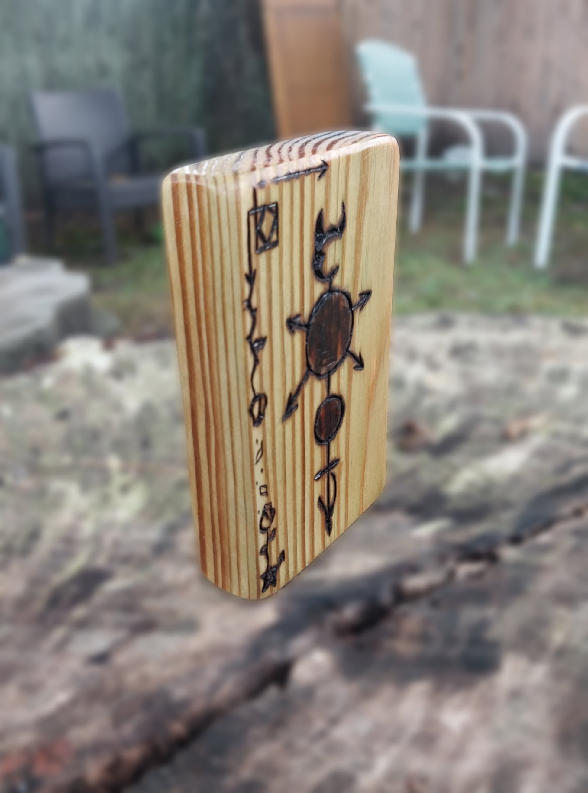 Standing in at 6 inches tall by 3 inches wide, by 1 inch thick. The wood used in this was ethically sourced and repurposed wood. The image burned in, the Sigil of Dark Lunar Spirit. Designed and created to be set up on your altar or surface. This glyph is designed to resonate the power and influence of the Dark Lunar Spirit. Or serve as a piece of decor in your sacred space, Altar, home, office, bedroom, or anywhere you choose. Meditate in front of it. Draw in to yourself, and your surroundings. Draw down the power of the Dark Lunar Spirit.