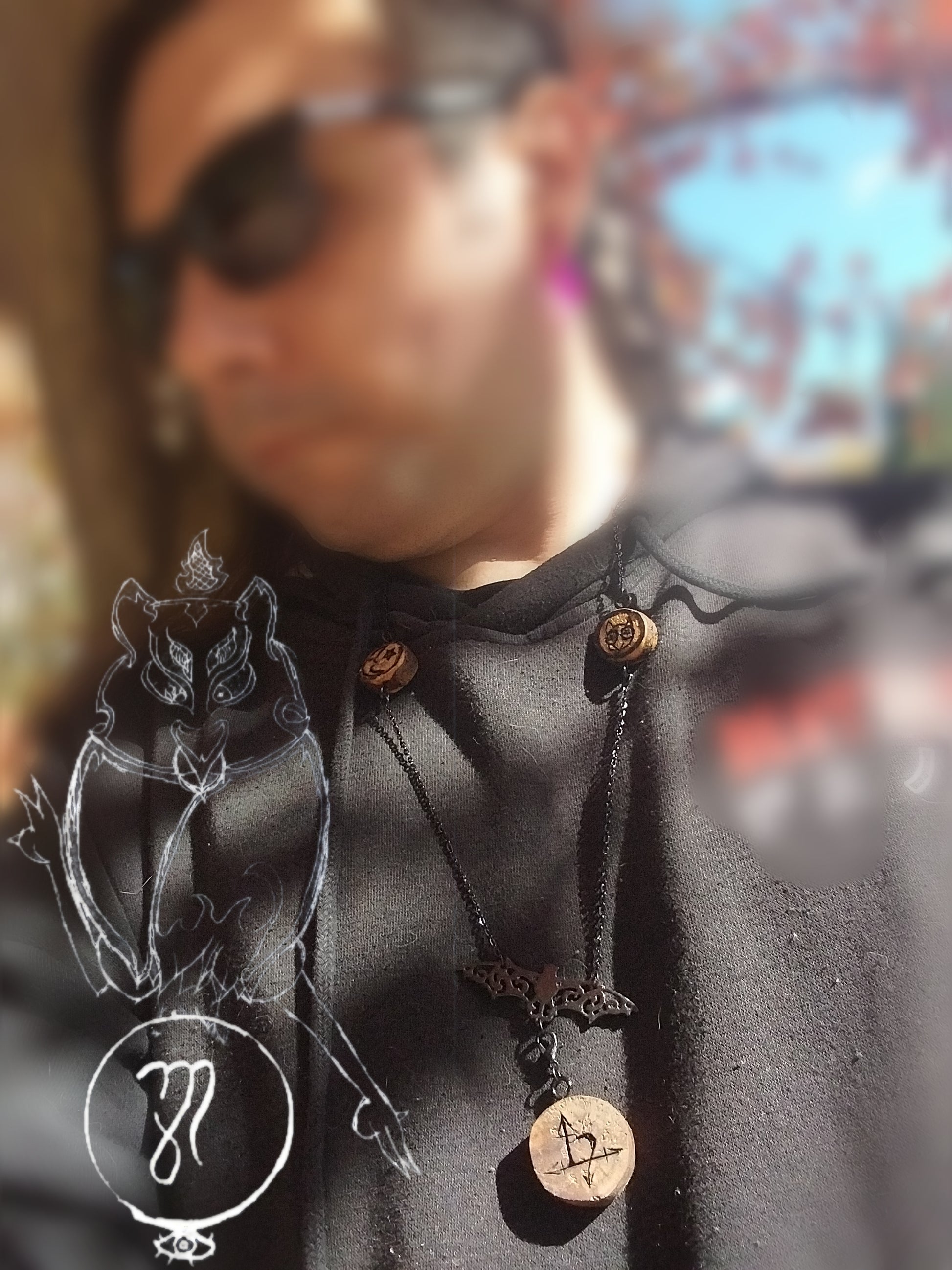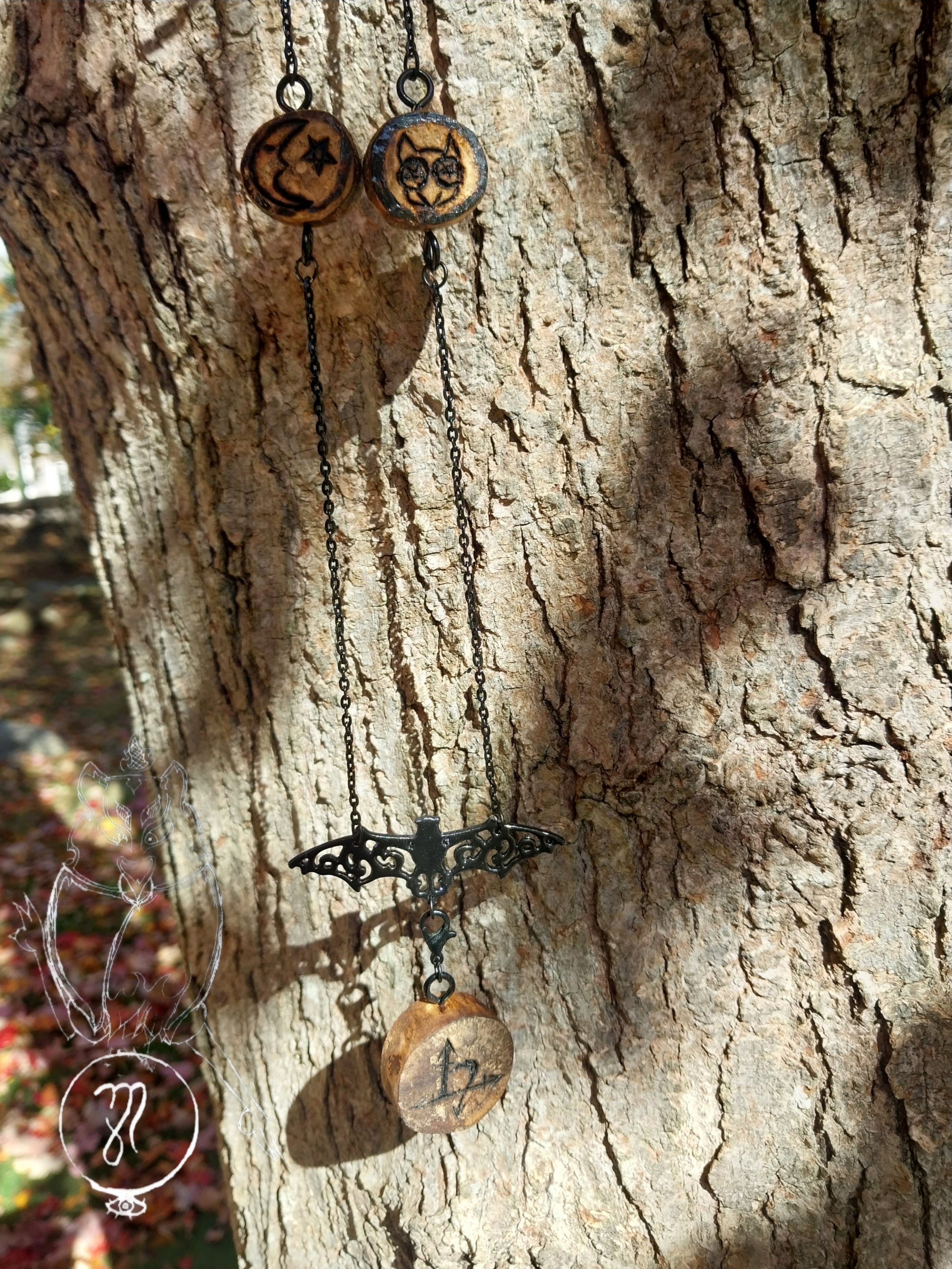 Moving on from the Medallion to the roughly 28 inch chain. Two beads bearing whimsigoth, cartoonish depictions. One of the moon and star, the other of an owl head with inverted pentagrams for pupils. Both beads are rough cut and moderately sealed with Tong oil. This is to preserve the beads and images burnt into them. The Necklace clasp is set for right hand. However I have left an option to have it changed over to left hand at no additional charge. If you would like to ensure accuracy of your order, you are more then welcome to and encouraged to reach out to me to double check on the change of clasp side. This is not at all required, simply a gentle offer for ease of mind on your part.