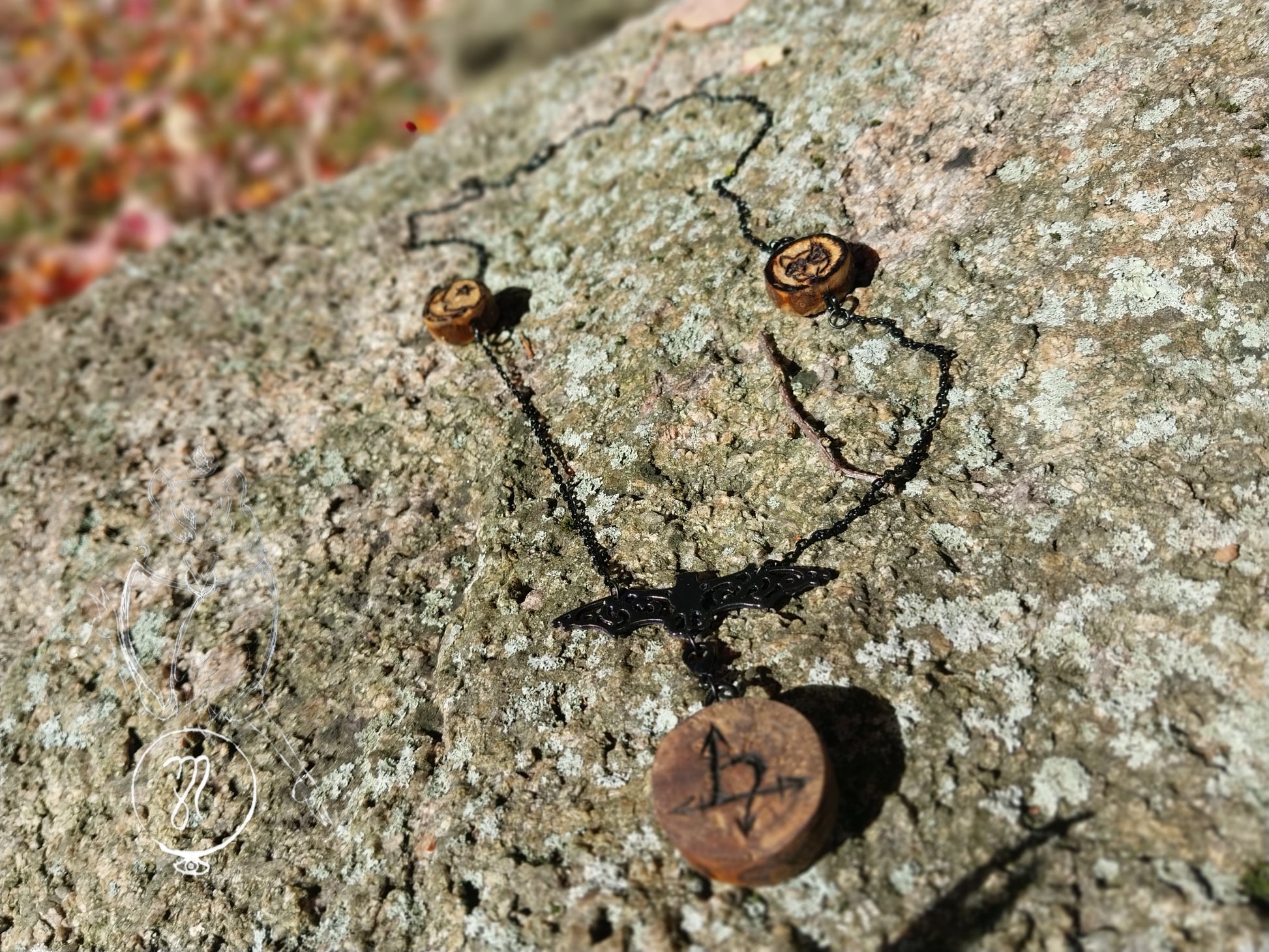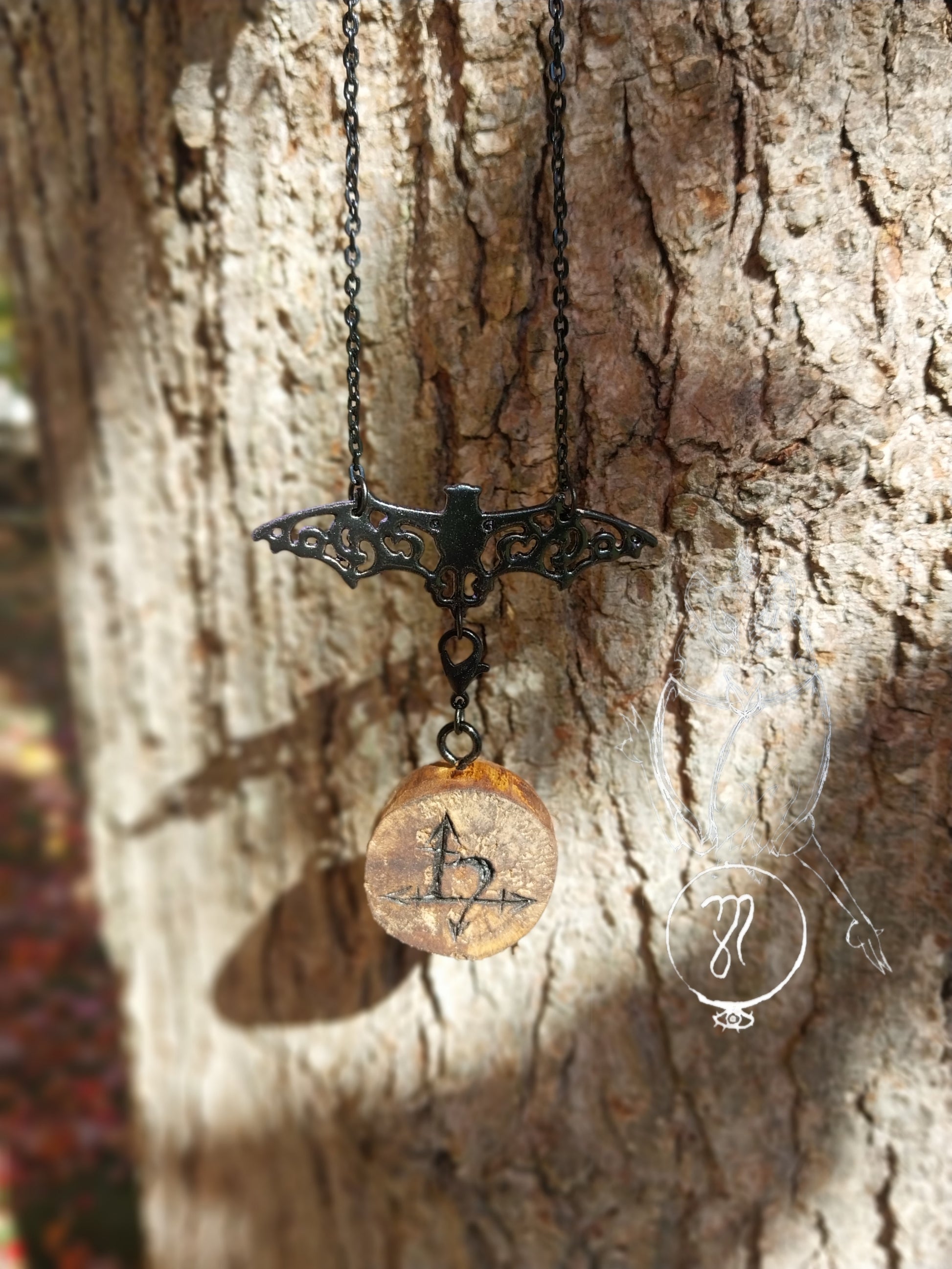 This necklace features a charm bearing the classical Occult sigil for Lilith. The charm itself is detachable with a standard necklace clasp. This gives you the freedom to move the charm from the necklace to other items. Giving you options to take the influence and power of Lilith along with you even if wearing the jewelry isn't practical. The charm is rough cut and hand sanded. It is sealed with a wood sealer to preserve the wood and image.