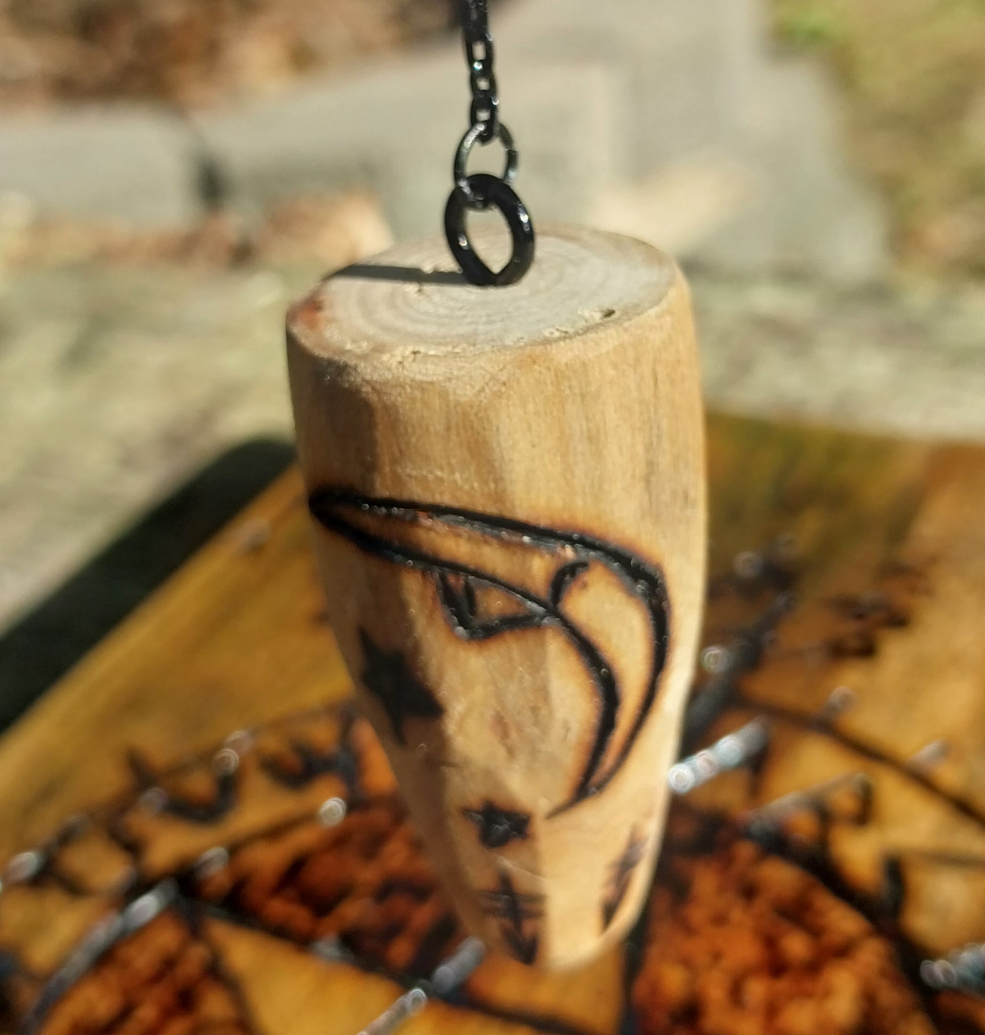 This Pendulum is of course made of repurposed, ethically sourced wood. it is coated moderately in an oil based sealer to protect the wood from the elements to a point. the main focus is the decorative "Seer's Bind-Rune" which is paired with the "Wyrd Tree Rune" and the crescent moon. The Bind-Rune itself is presented along side a raven, long since representing as sort of messengers of the currents of time, amongst other things, depending on tradition and culture.