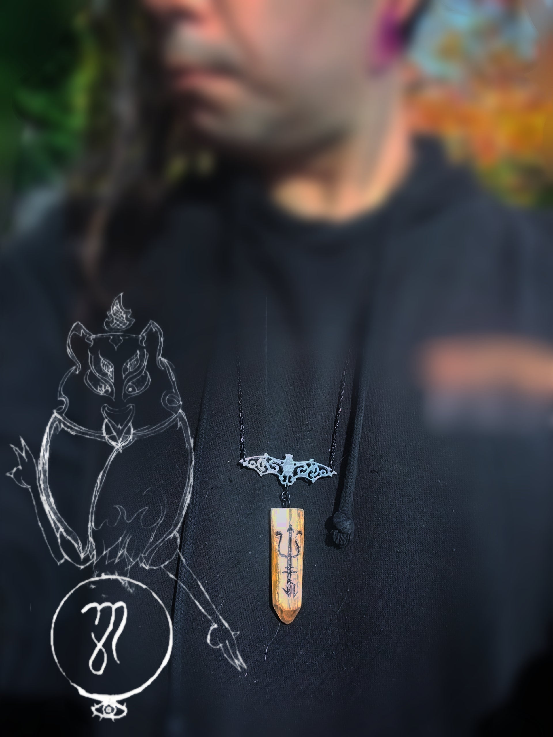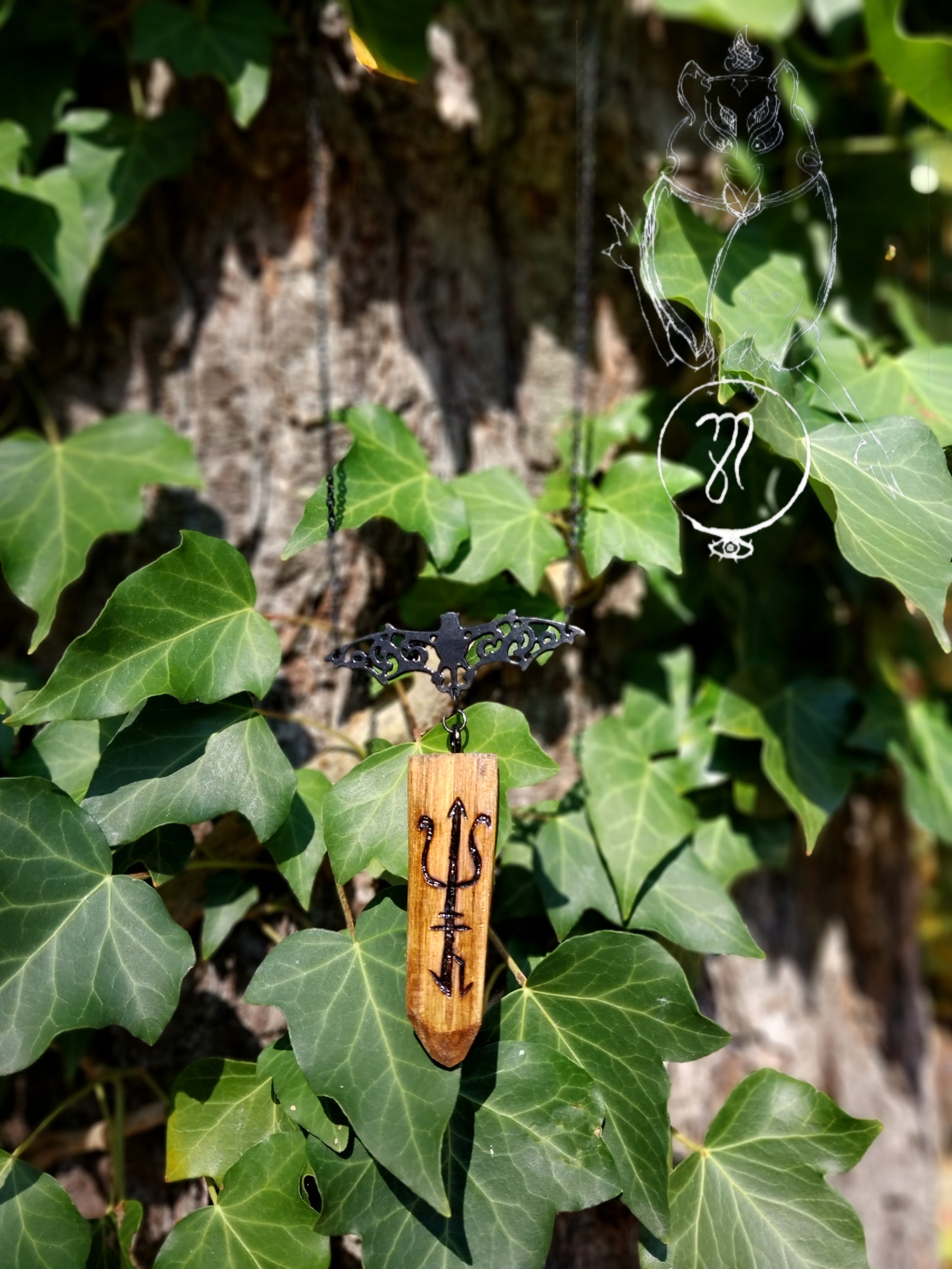 The wooden talisman sits clutched in the grasp of a black metal bat medallion. The chain sits at approx. 28 inches long. The clasp is set to the right hand side but i have set up an option to have it changed over to left hand at no additional cost. It is not required but welcomed if you would like to reach out after making your order to ensure any changes to the clasp side were accepted.